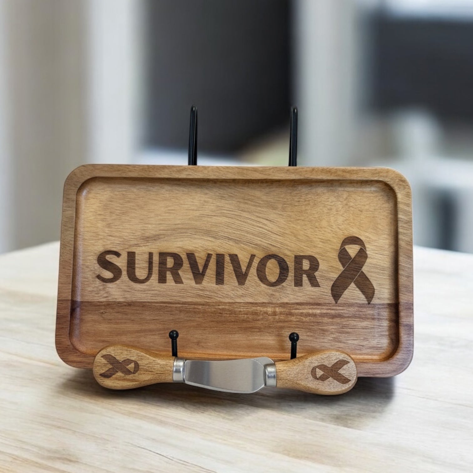 This beautiful engraved cheeseboard set makes the perfect gift for game day, holidays, housewarmings, client gifts, or charcuterie lovers. Each set includes a hardwood board paired with a matching knife and fork—both featuring coordinating engraved handles for a complete, gift-ready look.